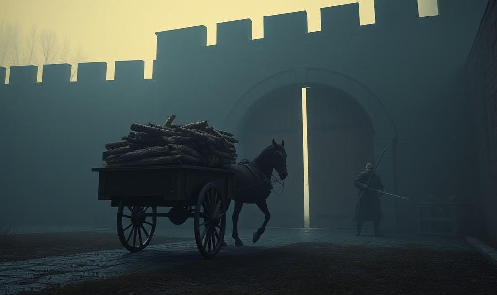 Dickson borrowed the clothing, horse, and wood cart of a local man who regularly supplied the castle with firewood. As dawn was breaking he rolled up to the gate, emerging out of the fog looking deceptively like the delivery bloke. The porter opened up. Dickson drove the cart into the gateway, then cut the horse loose so the cart jammed fast between the gates, stopped them from shutting. He killed the porter with his knife, grabbed an axe he’d hidden under the wood, signalled to the 30-strong ambush waiting nearby, then wailed into some more lethal work. Douglas and his men surged in behind him and they took the castle before the English soldiers were out of bed.[2][3]